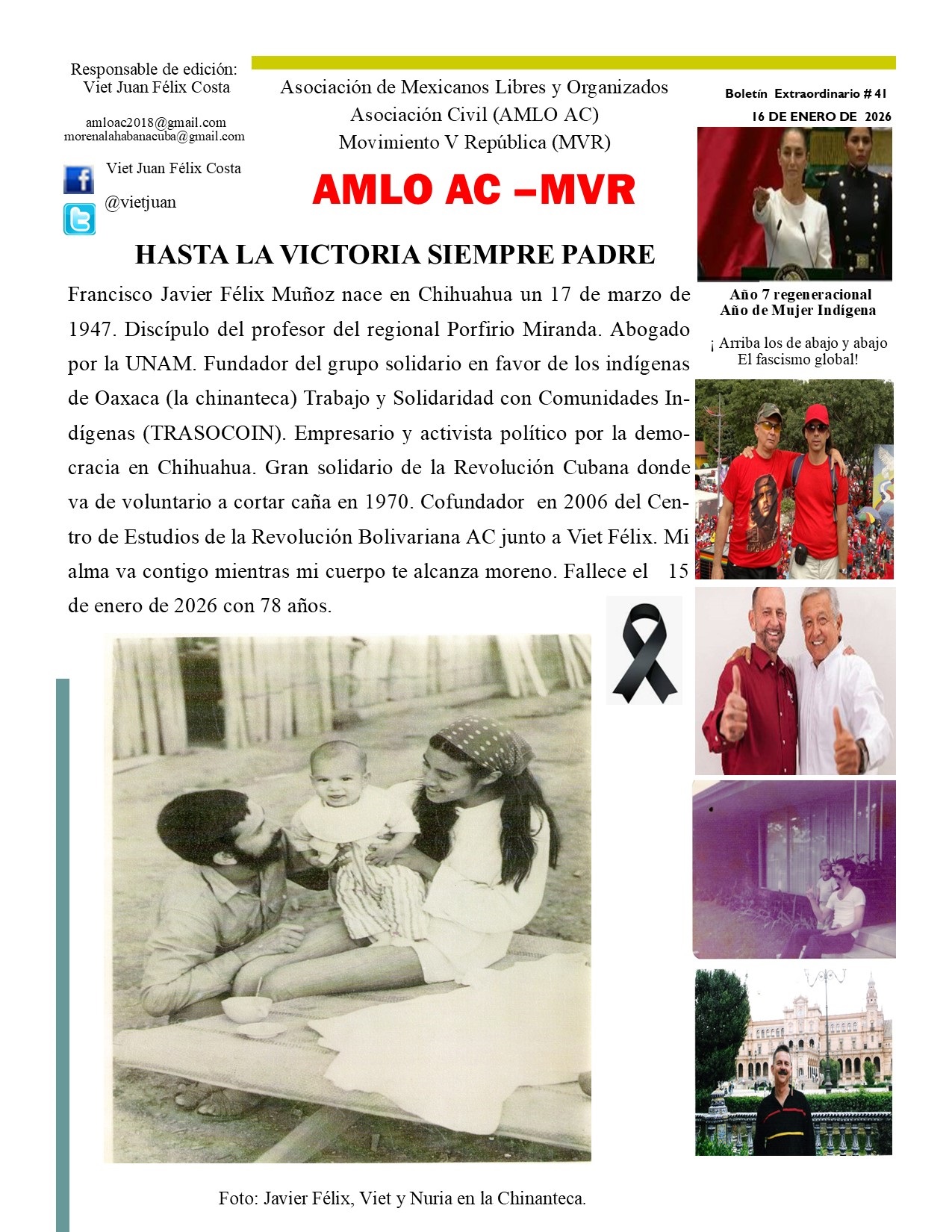 El Comité morena Cuba; Asociación de Mexicanos Libres y Organizados AC-Movimiento V República (AMLO AC-MVR) y el Centro de Estudios de la Revolución Bolivariana AC presentan las siguientes: